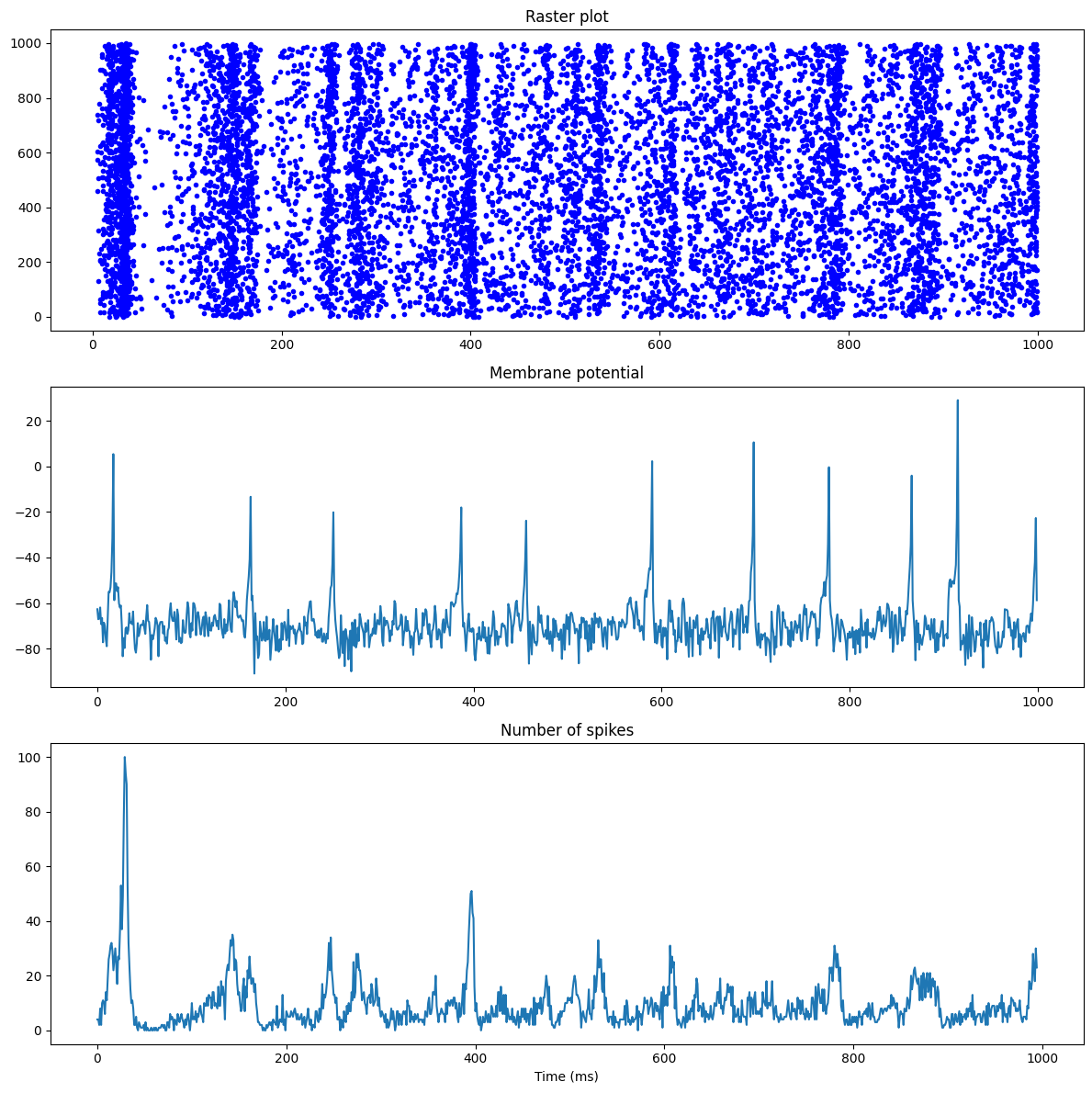m = ann.Monitor(pop, ['spike', 'v'])We run the simulation for 1000 milliseconds: