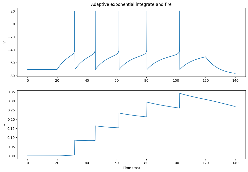 dv/dt = (v_rest - v + delta_T * exp( (v-v_thresh)/delta_T) )/tau_m + ( g_exc * (e_rev_E - v) + g_inh * (e_rev_I - v) )/cm