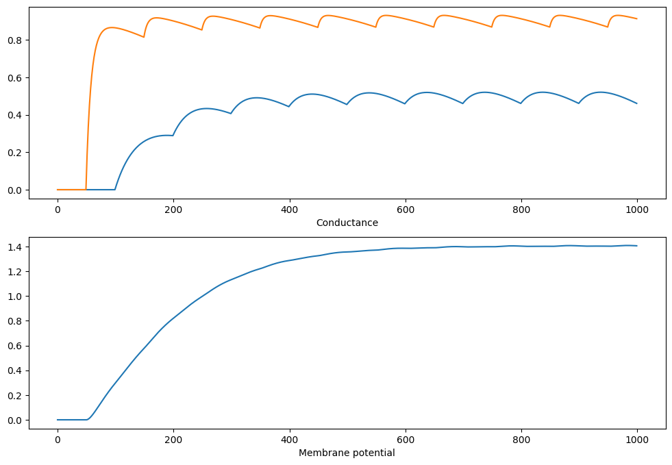 Integrator = ann.Neuron(equations="dv/dt = 0.1*(g_exc -v)", spike="v>2.0", reset="v=0.0")