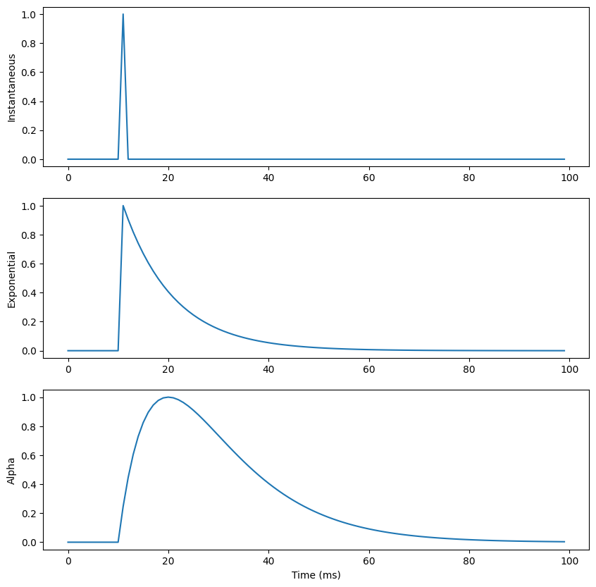 This notebook simply demonstrates the three main type of synaptic transmission for spiking neurons: